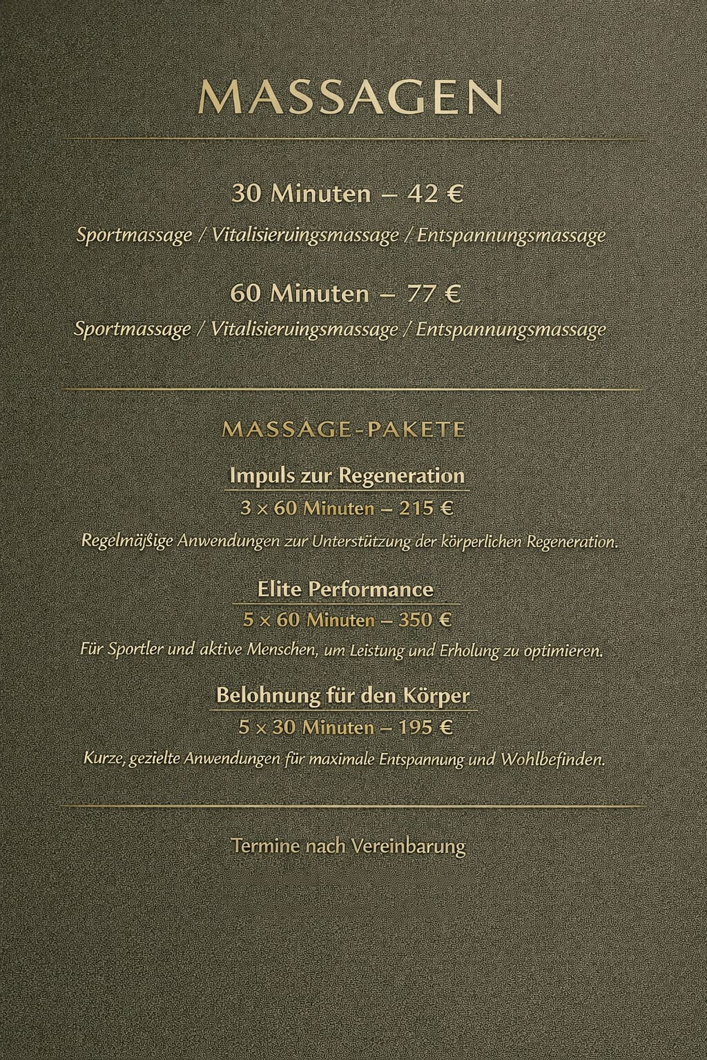 Jeder meiner Massagen ist individuell auf Sie abgestimmt und persönlich von mir durchgeführt. Dabei kombiniere ich Elemente aus Sportmassagen, Deep-Tissue-Techniken und spezielle Grifftechniken, die ich im Laufe der Zeit entwickelt und zu meiner persönlichen Signatur gemacht habe. So entsteht ein maßgeschneiderter, wirkungsvoller Ansatz – sowohl zur Regeneration, Entspannung und Stressabbau, als auch zur Leistungssteigerung und Optimierung der Beweglichkeit.
